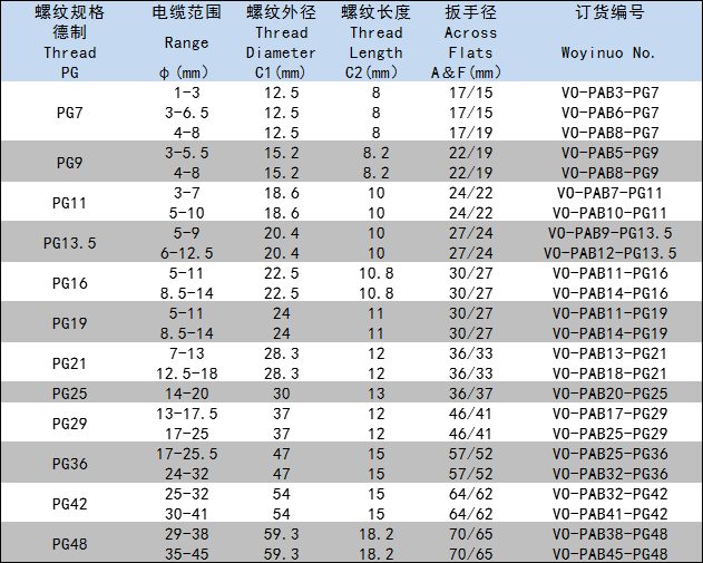 使用方法:VO-PAB型尼龍電纜接頭是電纜的配套產(chǎn)品,接頭可將電纜鎖緊,另一端可接入設(shè)備箱體上,也可以根據(jù)選用螺紋,接入進(jìn)出口為內(nèi)螺紋的電動(dòng)設(shè)備上。