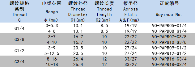 使用方法:VO-PAP型尼龍電纜接頭是電纜的配套產(chǎn)品,接頭可將電纜鎖緊,另一端可接入設(shè)備箱體上,也可以根據(jù)選用螺紋,接入進(jìn)出口為內(nèi)螺紋的電動設(shè)備上。