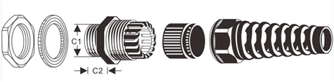 產(chǎn)品材質(zhì):A.C.F部分采用UL認(rèn)可之尼龍PA66(防火等級UL94V-2)制成;(可定制UL認(rèn)可的V-0防火等級尼龍原料);B.D部分采用三元乙丙耐候橡膠制成。(可定制耐寒、耐高溫橡膠;耐高酸堿、耐化學(xué)與抗腐蝕橡膠)。